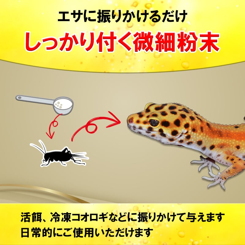 爬虫類の餌(コオロギなど)に適量をふりかけて与えてください。